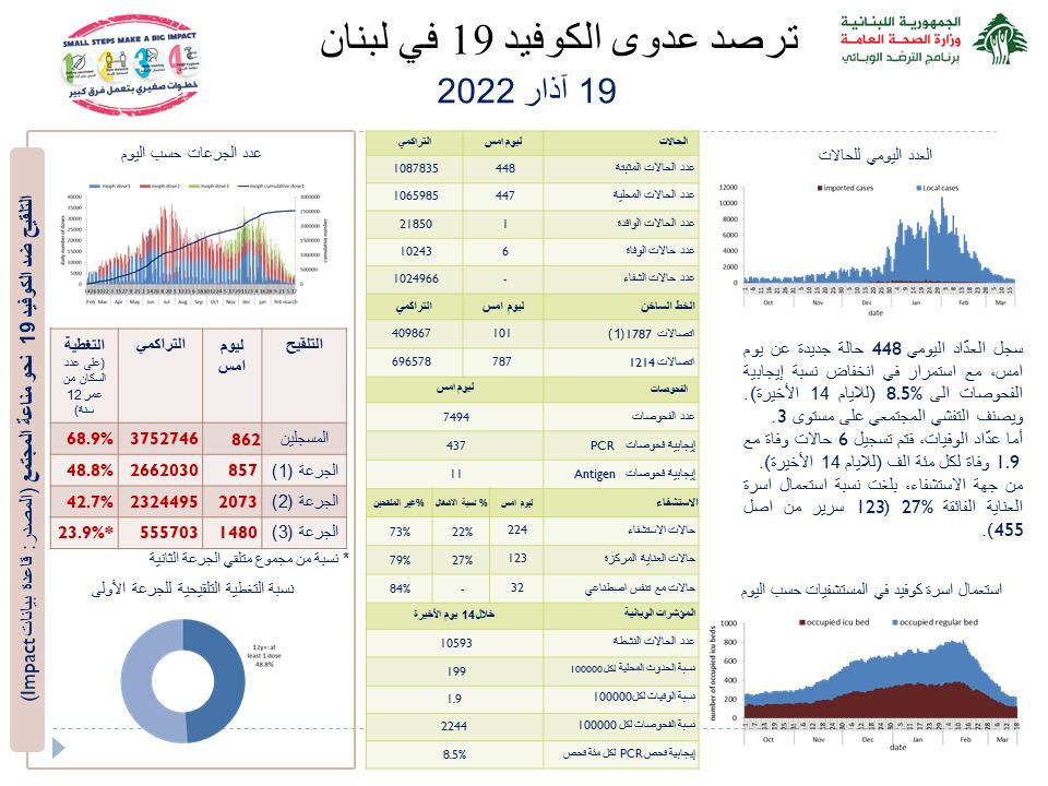 أعلنت وزارة الصحة العامّة في تقريرها اليومي حول مستجدات فيروس كورونا اليوم السبت, عن “تسجيل 448 إصابة جديدة بكورونا (447 محلية واصابة وافدة) ليصبح العدد الإجمالي للإصابات 1087835”.